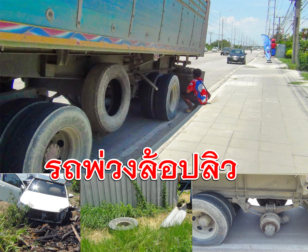 ฉะเชิงเทรา-พ่วงล้อปลิว หลุดลอยข้ามเลนมาไกลก่อนตกลงมาใส่รถยนต์กระบะที่ขับสวนทางมา ทำเสียหลักตกถนนลงข้างทางมุดเข้าในเตาเผา...