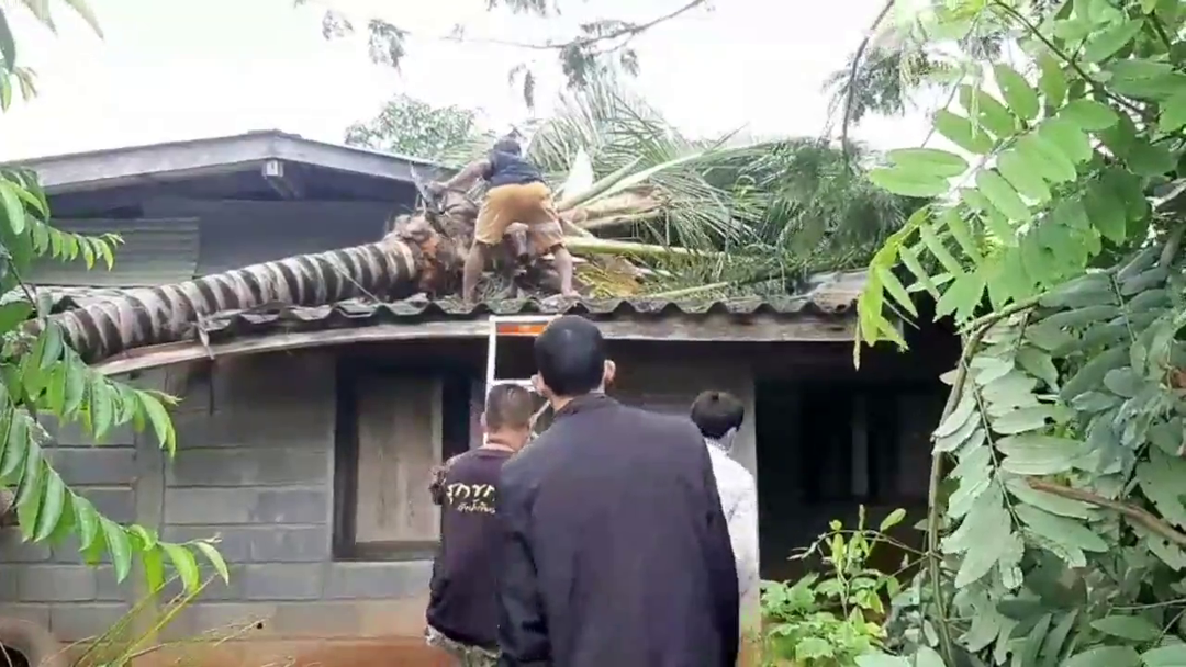 นครราชาสีมา-ช้างเขาใหญ่ ล้มต้นมะพร้าวทับบ้านเรือนประชาชนพัง โชคดี ไม่มีผู้ได้รับบาดเจ็บ และเสียชีวิต