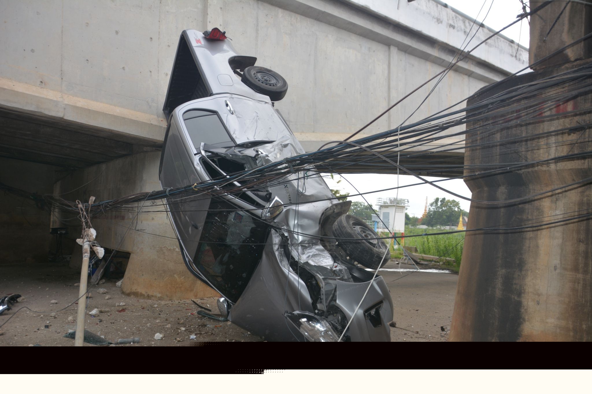 กระบะซิ่งขึ้นสะพานถนนลื่นรถตกสะพาน หวิดดับ