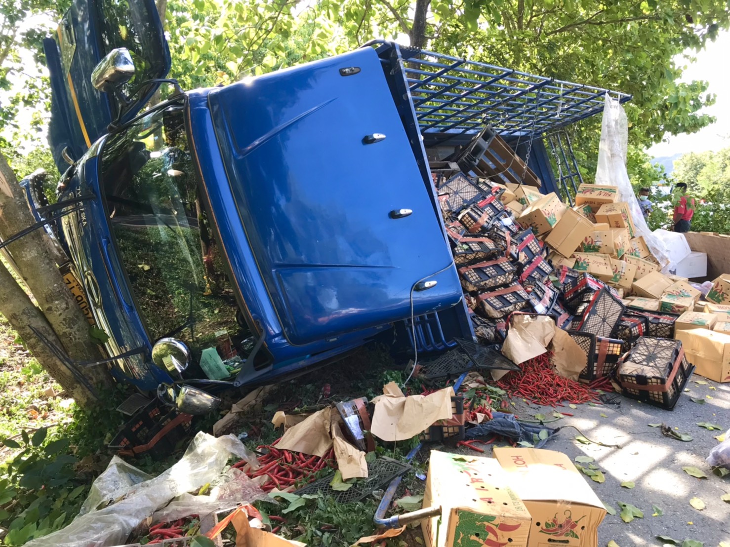 รถขนพริกหักหลบรถกระบะเปลี่ยนเลนส์ เกิดพลิกคว่ำพริกตกเกลื่อนถนน
