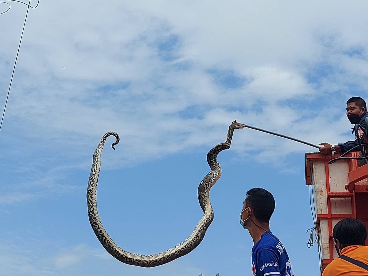 งูเหลือมยักษ์ปีนเสาไฟอาสาใช้รถกระเช้า ทุลักทุเลกว่าเจ้างูจะยอมแพ้
