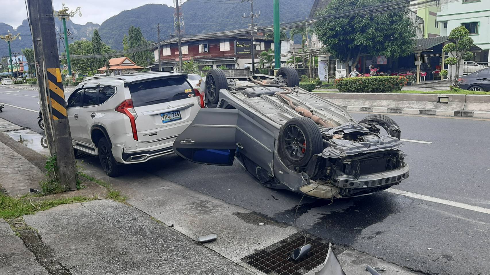 พังงา-หวิดดับหนุ่มขับเก๋งรีบไปเฝ้าเมียคลอดในโรงพยาบาลหลับในชนเกาะกลางถนนหงายท้องล้อชี้ฟ้า