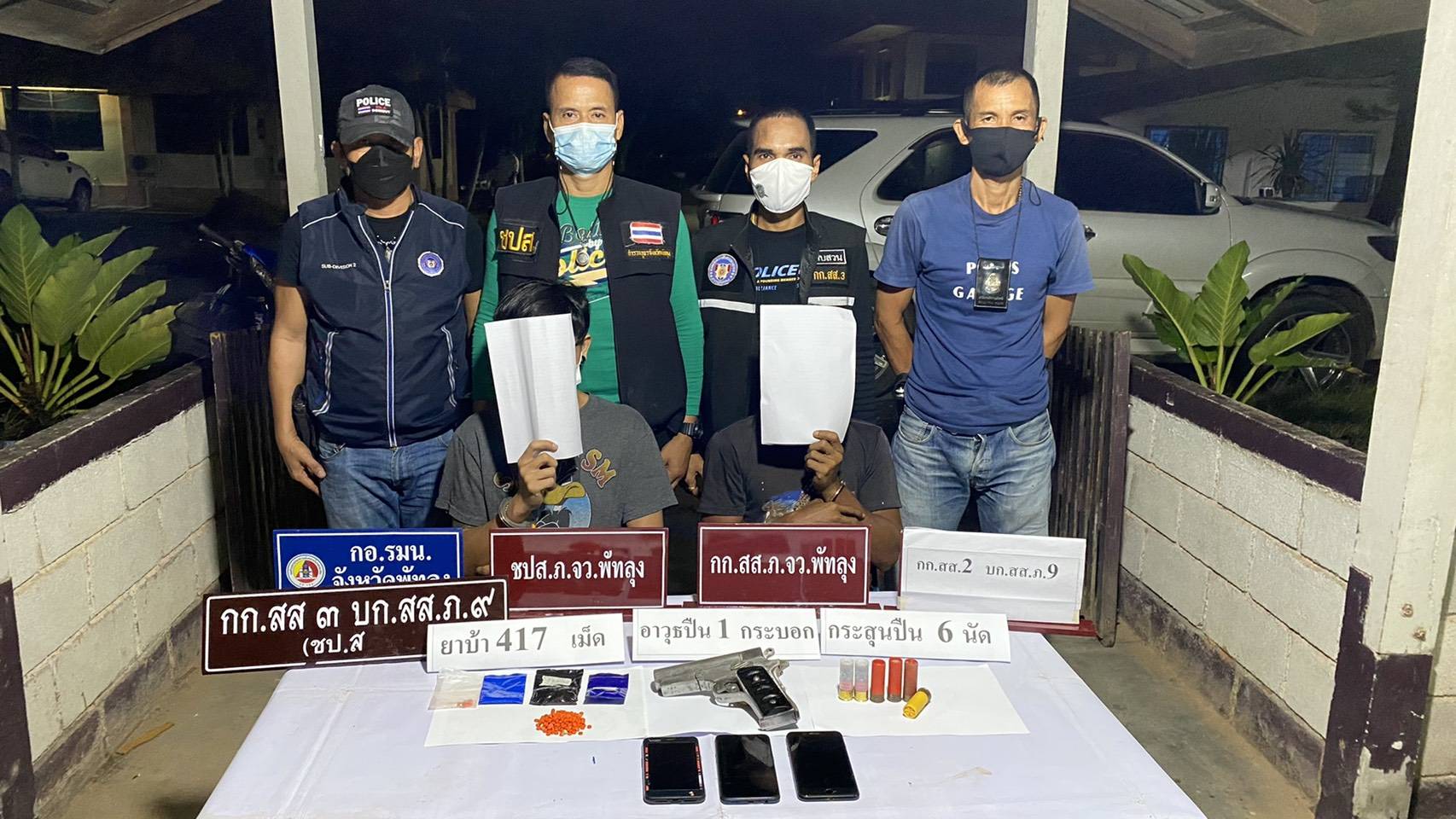 พัทลุง-ตำรวจปปส.รวบ2นักค้ายาเสพติดพร้อมอาวุธ และขยายผลจับอีกพร้อมยึดยาบ้าได้202 เม็ดกลางสวนยาง อ.ป่าบอน จ.พัทลุง