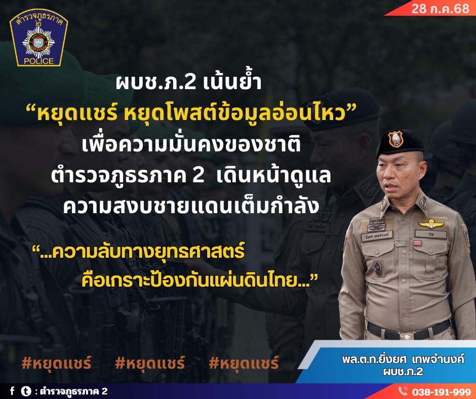 ผบช.ภ.2เน้นย้ำหยุดแชร์หยุดโพสต์ข้อมูล อ่อนไหวเพื่อความมั่นคงของชาติ