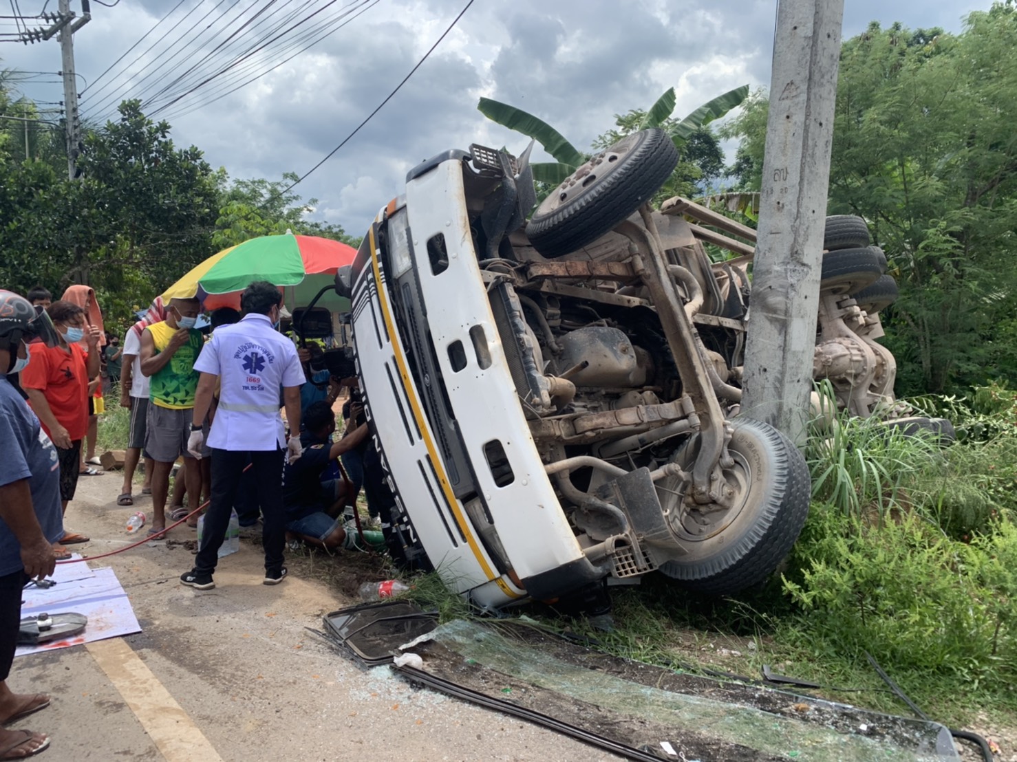 พัทลุง-รถ6ล้อโม่ปูน หลุดโค้งชนเสาไฟฟ้า คนขับเจ็บสาหัสติดภายใน ใช้เวลาร่วม 2 ชม.กว่านำคนเจ็บออกจากซากรถได้