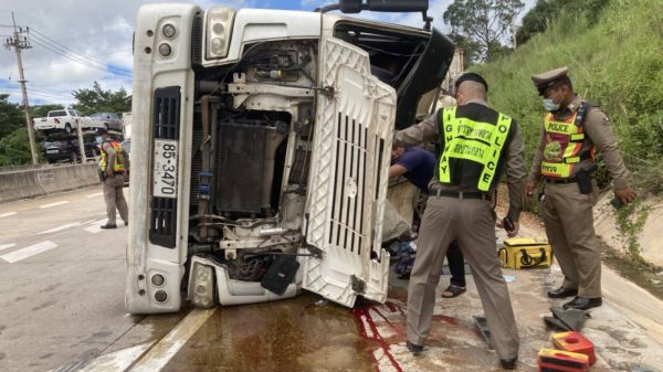 ระวังภัย!รถพ่วง18ล้อเบรกแตกลงเขาโทน รถพลิกค่ำผัวอาการสาหัสเมียดับคาที