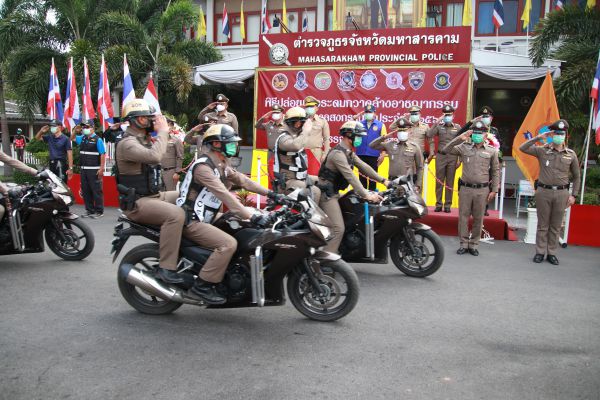 มหาสารคาม-ตำรวจภูธรจังหวัดมหาสารคาม ปล่อยแถวระดมกวาดล้างอาชญากรรม รักษาความสงบเรียบร้อยและการดูแลอำนวยความสะดวกด้านการจร...