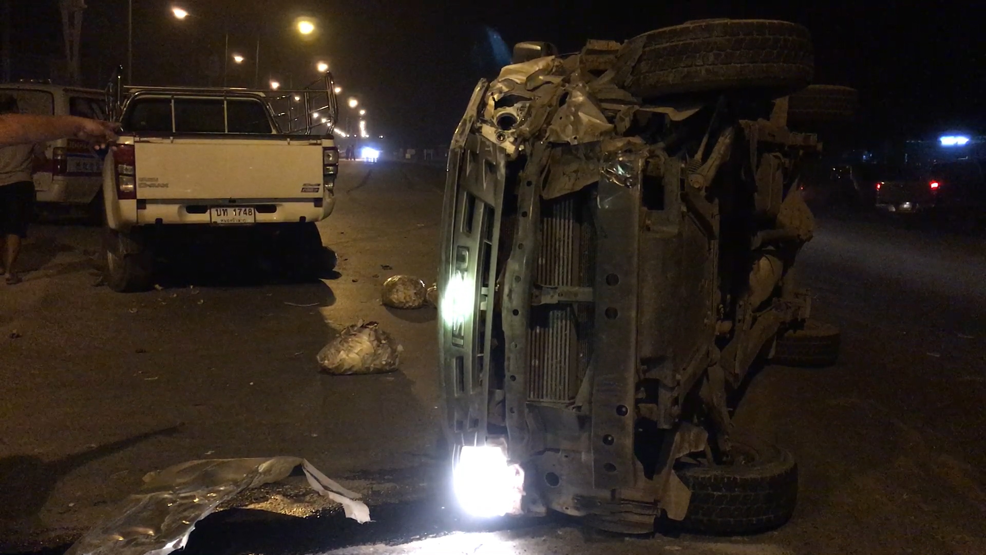 หนองบัวลำภู-ชนสนั่นกลางดึกกระบะตัดหน้ารถส่งเห็ดพลิกคว่ำตะแคงกลางถนนเด็กชายวัย 6 ปีได้รับบาดเจ็บสาหัส