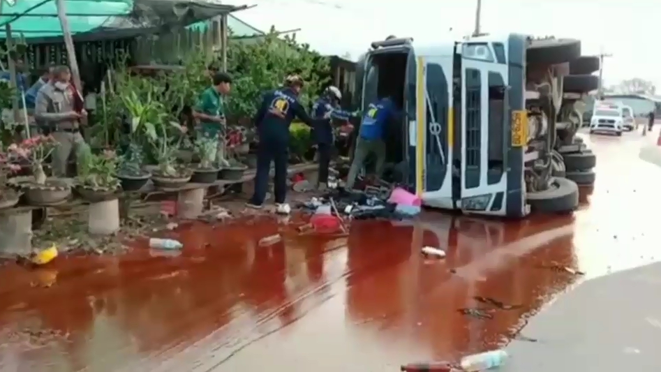 ชัยภูมิ-รถบรรพวงบรรทุกกากน้ำตาลแหกโค้งพลิกคว่ำเทกระจาดคนขับดับคาที่