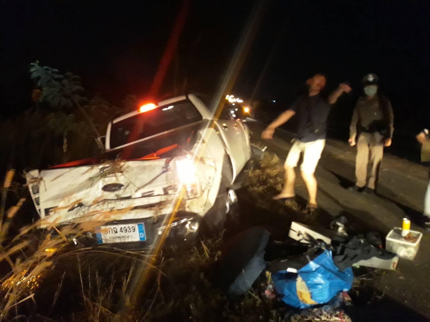 หนุ่มเมืองกรุงซิ่งกระบะเที่ยวเมืองเลย เกิดเสียหลักชนเสากระเด็นตกร่องน้ำคนรอด