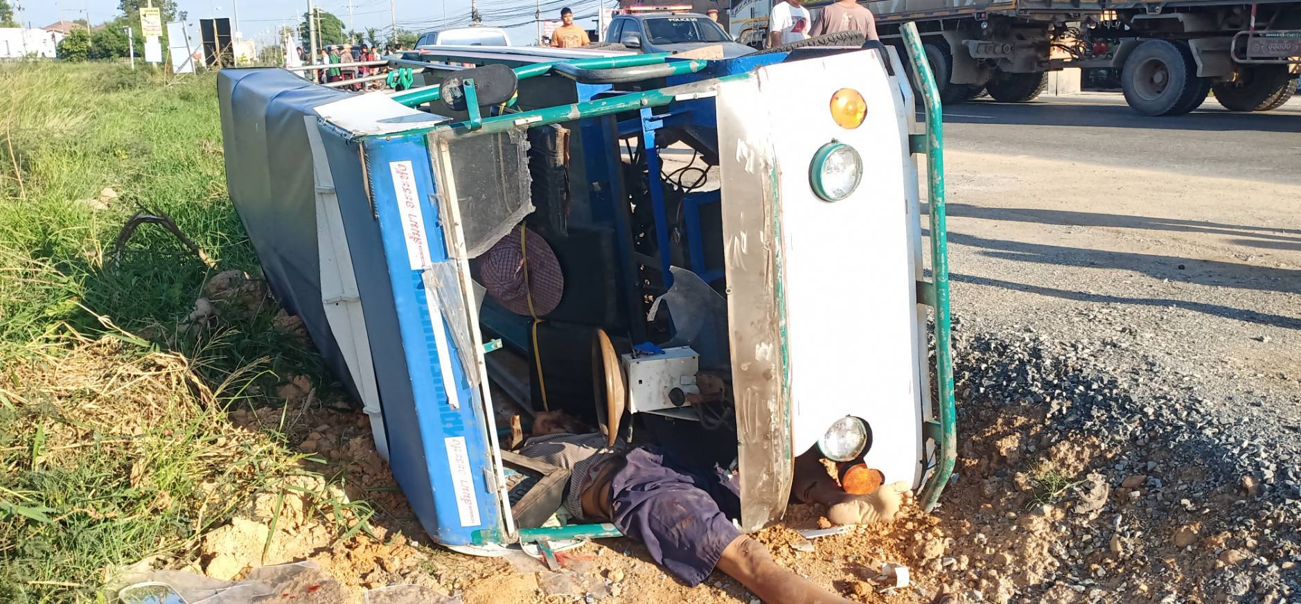 รถสิบล้อซิ่งนรกตูม!!รถอีแต๋นบรรทุกพระ พริกคว่ำทับคนขับดับคาที่พระหัวแตก