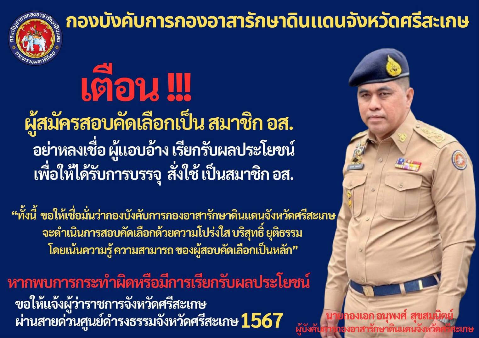 ศรีสะเกษ-ผู้ว่าฯศรีสะเกษ เตือนอย่าหลงเชื่อบุคคลแอบอ้างเรียกรับผลประโยชน์-ช่วยเหลือ สอบบรรจุ อส. ลั่นดำเนินการตามกฎหมายจร...