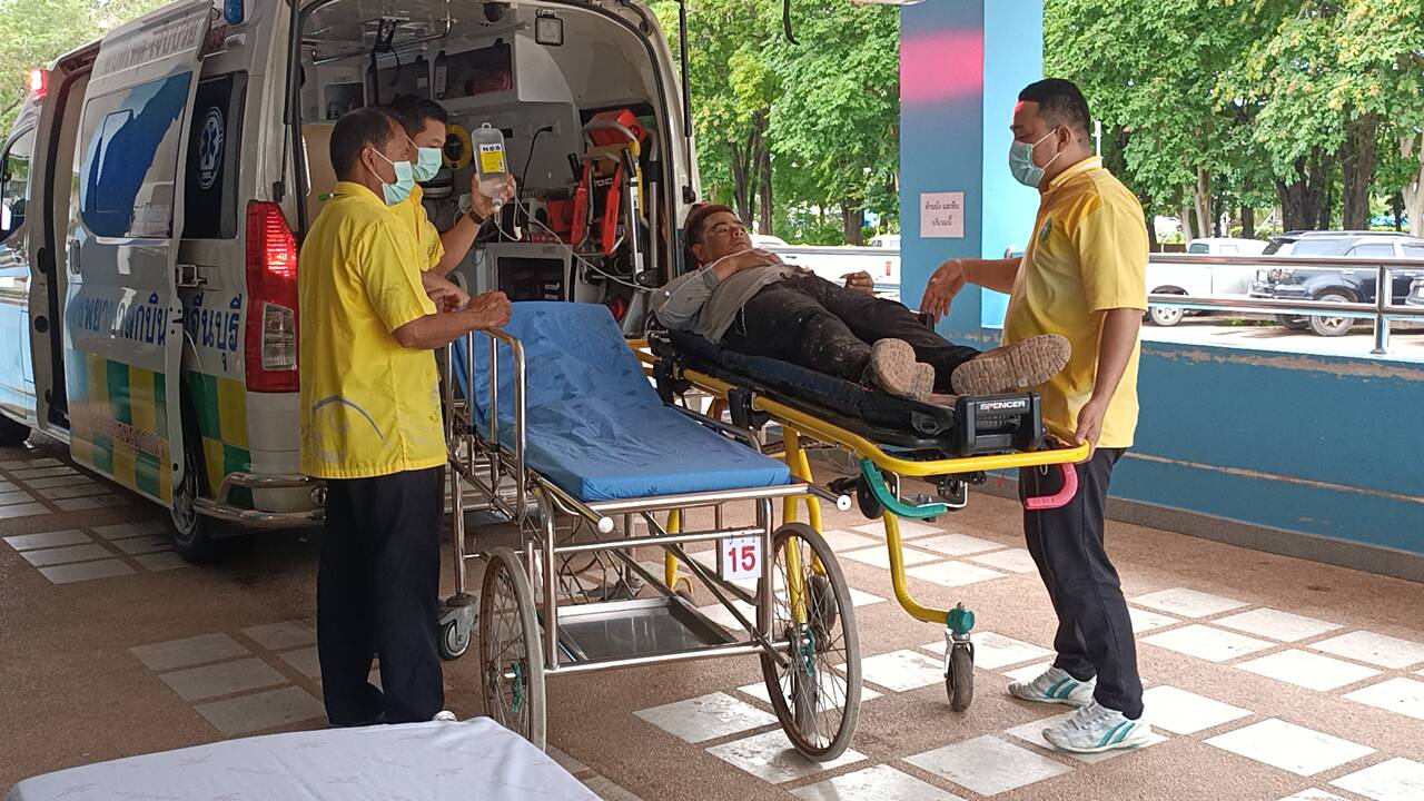ฝนตกหนุ่มก่อสร้างถูกไฟฟ้าแรงสูงช็อต หวิดดับเหตุกระเช้าพาดสายไฟแรงสูง