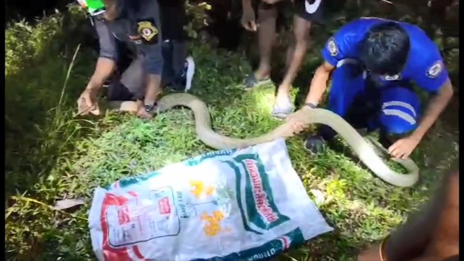 สงขลา-จงอางตัวใหญ่เลื้อยมากับความมืดซุกใต้กระถ่างต้นไม้ เจ้าบ้านผวาแจ้งทีมปราบอสรพิษอาสาพิทักษ์งู จ.สงขลา มาช่วยจับ