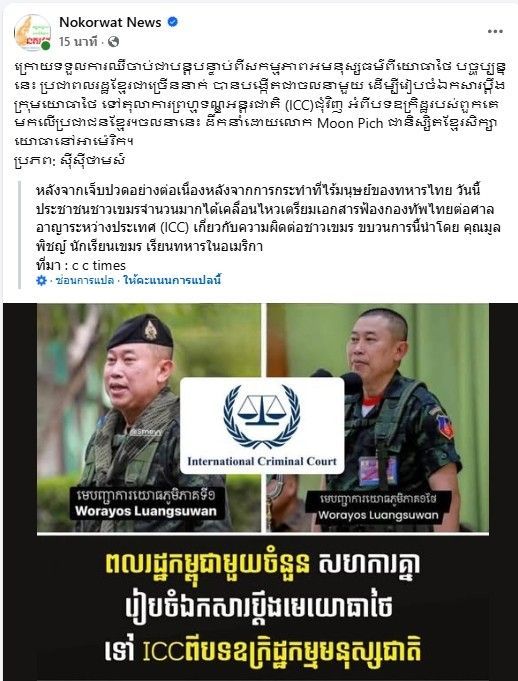 กรุงเทพฯ-สื่อ Nokorwat News เผยแพร่ข้อมูลและนำภาพแม่ทัพภาคที่ 1 โพสต์ข้อความเตรียมรวบรวมข้อมูลเอกสารฟ้องร้องกองทัพไทย ต่...