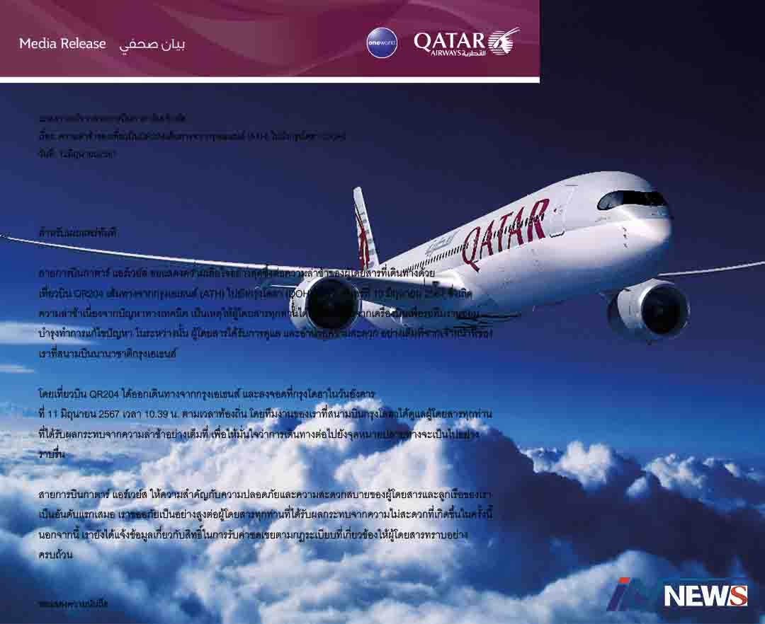 กรุงเทพฯ-สายการบินกาตาร์ แอร์เวย์สได้ออกแถลงการณ์จากสายการบินกาตาร์ แอร์เวย์สเรื่อง: ความล่าช้าของเที่ยวบิน QR204&n...