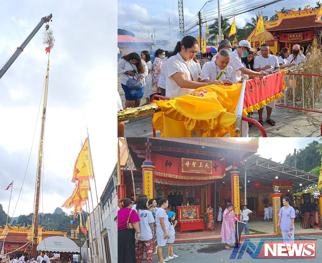 พังงา-ชาวพังงาร่วมยกเสาโกเต้ง สูงที่สุดในโลกที่ศาลเจ้าแม่ม่าจ้อโป๋ เริ่มประเพณีถือศีล-กินผัก ปี 2566