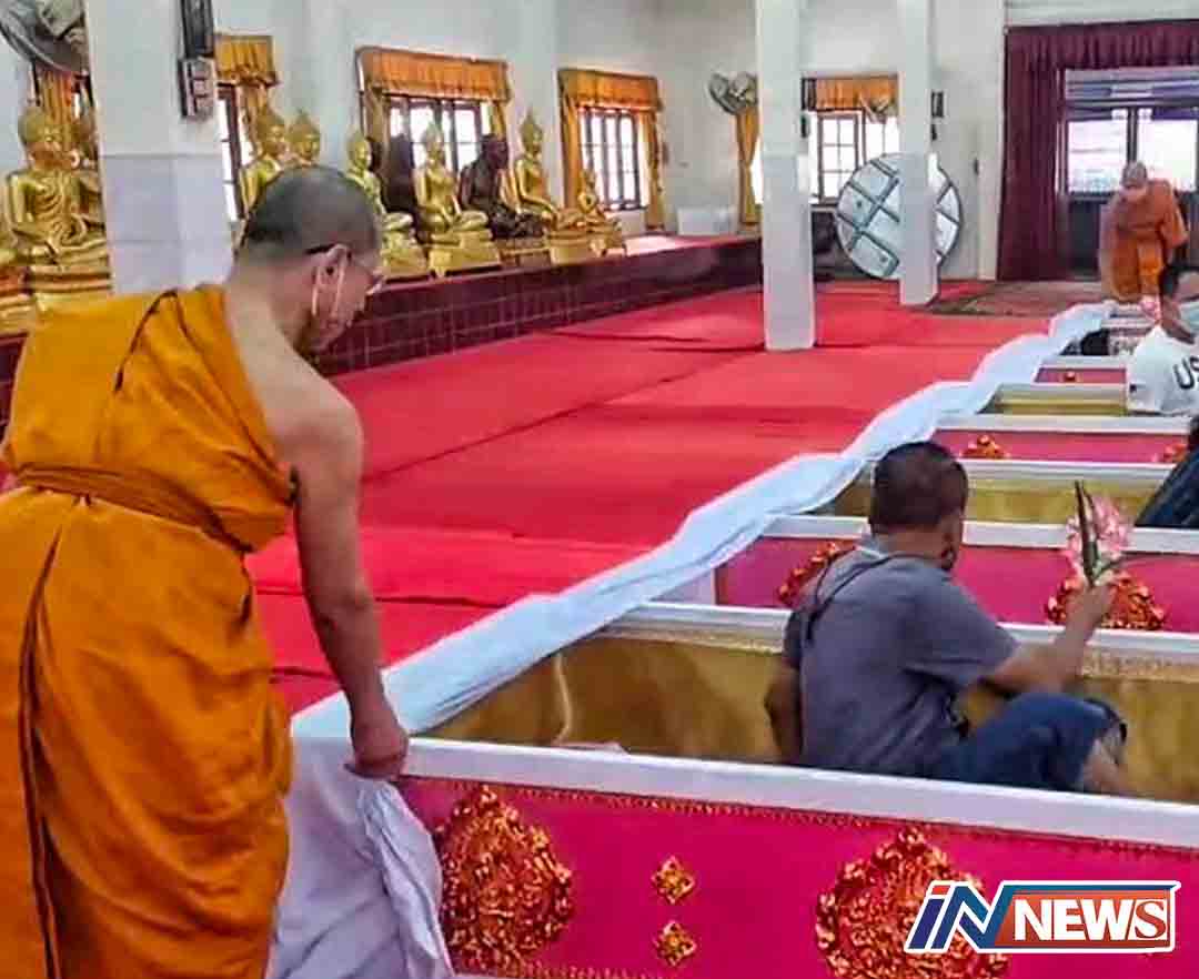 นครนายก-วัดหลวงพ่อปากแดง จัดพิธีนอนโลงศพสะเดาะเคราะห์ต่อชะตา ฝึกตายก่อนตายจริงฝึกสติให้คิดได้ว่าทุกคนหนีไม่พ้นความตาย