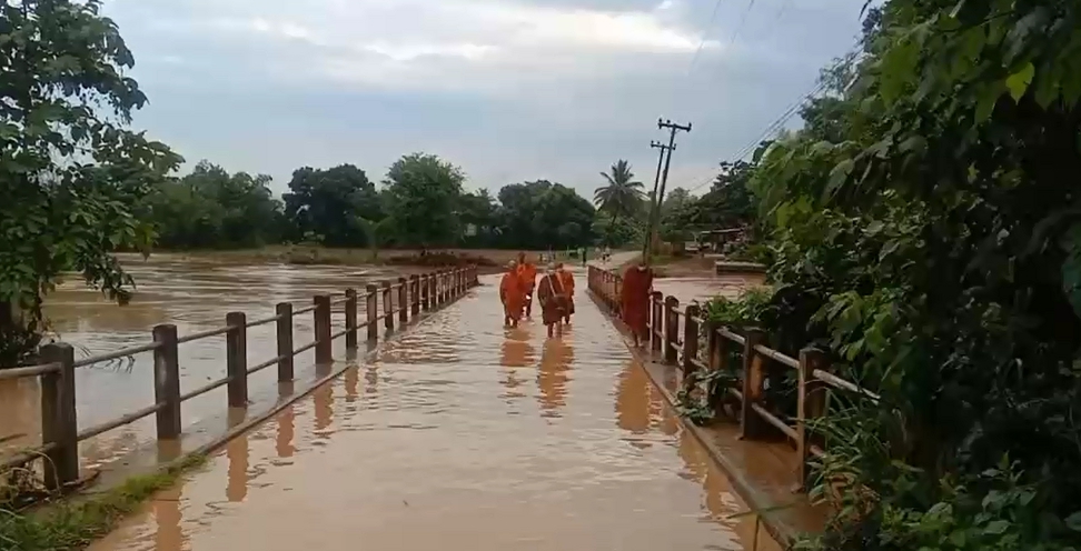 ชัยภูมิ - น้ำป่าที่ทะลักลงจากเขาพังเหยไหลลากท่วมถนนหลายหมู่บ้านถุกตัดขาดจากโลกภายนอกพระสงทนหิวไม่ไหวต้องเดินลุยน้ำออกบิณ...