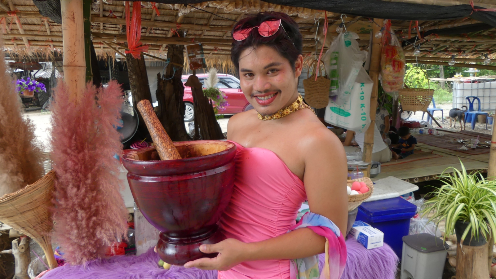 ราชบุรี - นทท.แห่ชิมส้มตำเจ้าของแต่งกายเป็นหญิง ที่ร้านตำลงเนิน กระเทยตำ