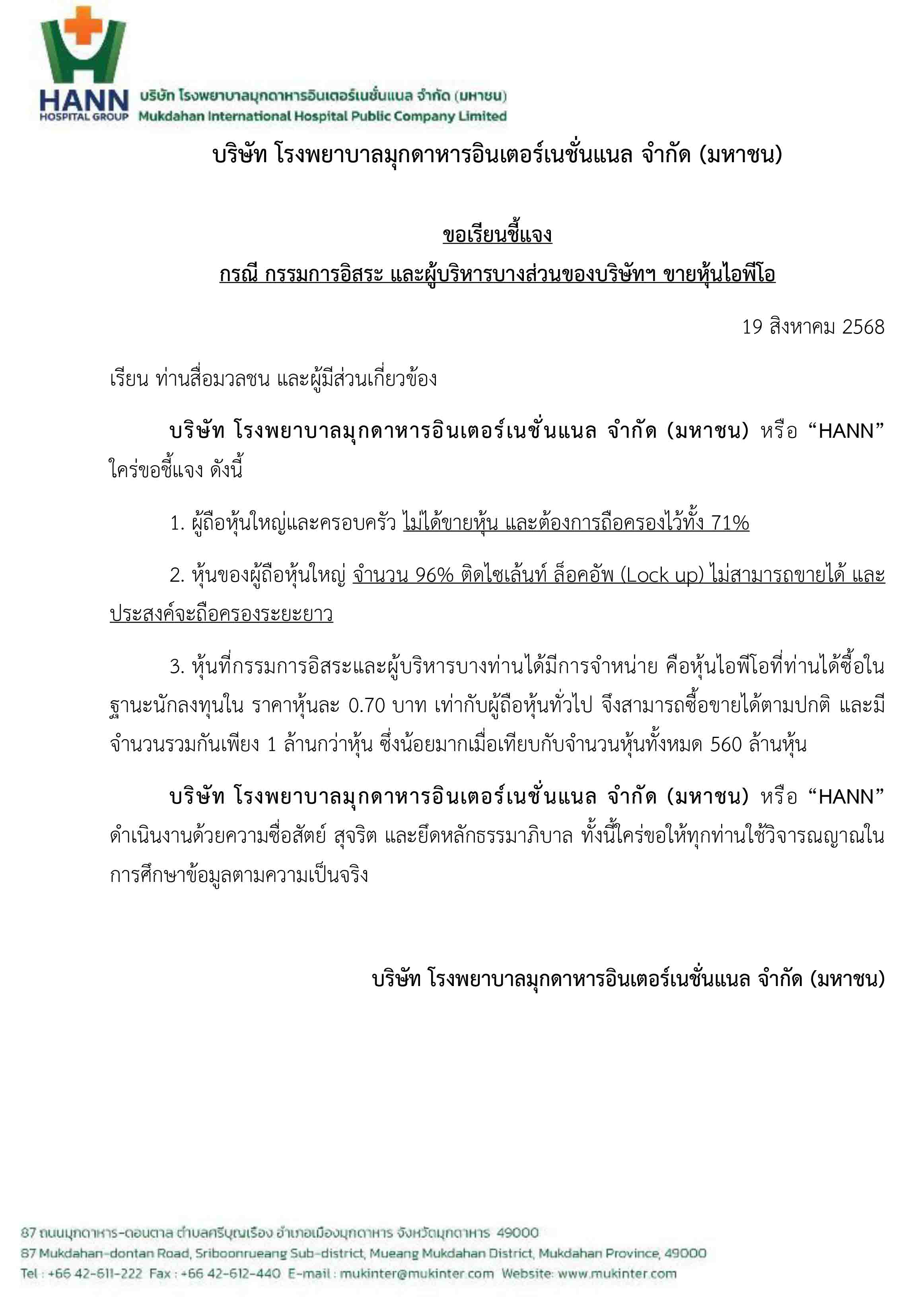 กรุงเทพฯ-19 สิงหาคม 2568 บริษัท โรงพยาบาลมุกดาหารอินเตอร์เนชั่นแนล จำกัด (มหาชน) หรือ “HANN&rd...