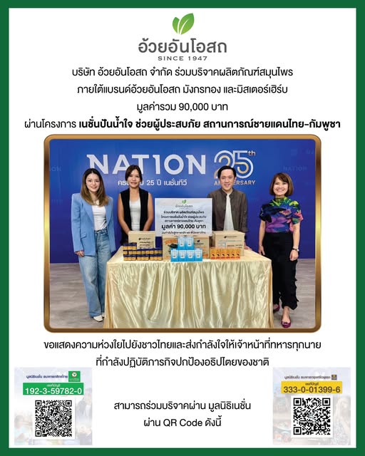 อ้วยอันโอสถร่วมส่งต่อความห่วงใยมอบ ผลิตภัณฑ์สมุนไพรผ่าน'เนชั่นปันน้ำใจ'