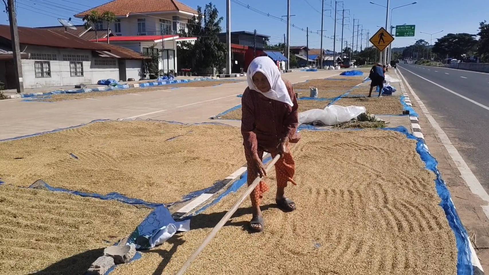 ชาวบ้านภูมิซรอลเร่งตากข้าวกลางถนน หวั่นสถานการณ์ชายแดนปะทุอีกรอบ