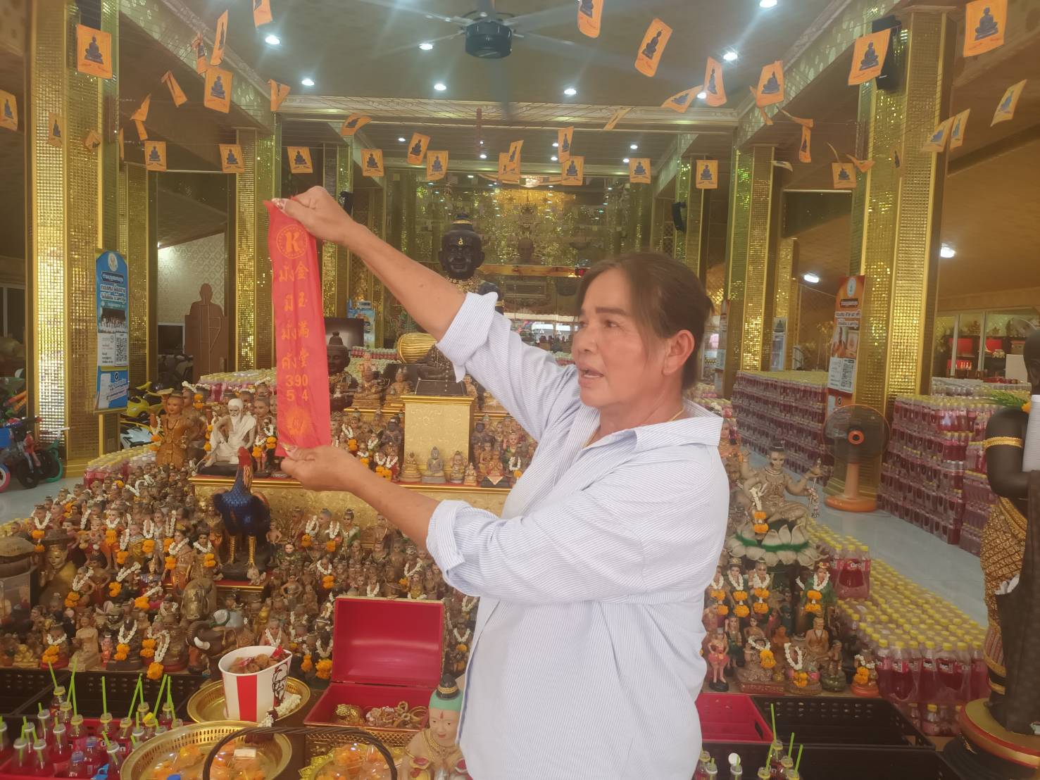 นครปฐม-สาวใหญ่ ชาวศรีราชา ชลบุรี นำไก่ทอดชื่อดังแก้บนถวายกุมารสมบัติ วัดไผ่ล้อมนครปฐม หลังได้โชคเลขท้ายสามตัวได้เง...