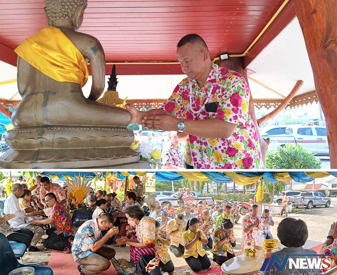 นายกทต.โพนทองนำลูกหลานจัดสรงน้ำ ขอพรความสิริมงคลก่อนเริ่มงานใหม่