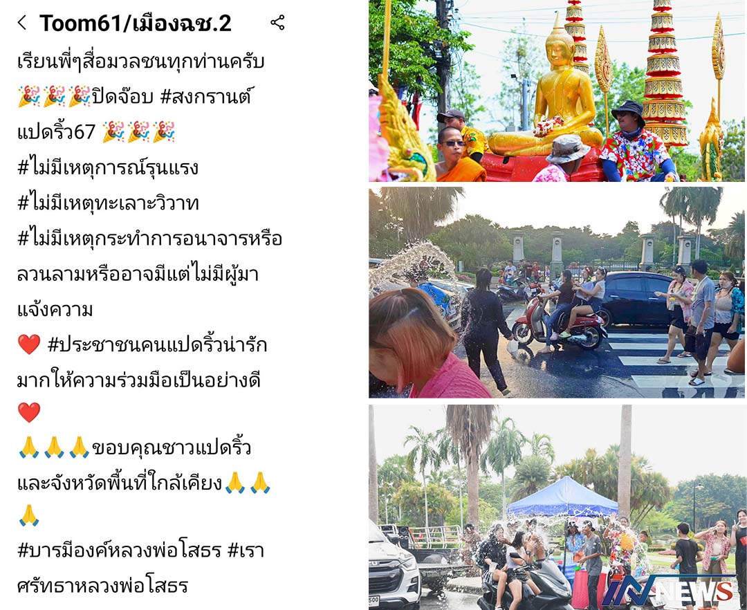 ตร.แปดริ้วโพสต์ขอบคุณปชช.เล่นสาดน้ำ ไร้ความรุนแรงคือ'เล่นสงกรานต์สะอาด'