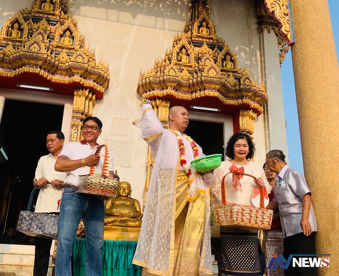 นายกทต.สามพรานร่วมงานบวชจัดเต็ม!! โปรยทาน5กระเช้าชาวบ้านงานร่วมคึก