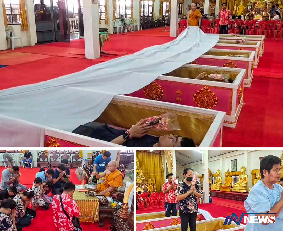 'วัดหลวงพ่อปากแดง'จัดพิธีนอนโลงศพ ฝึกตายไว้ก่อนตายจริงฝึกสติให้คิดปลง