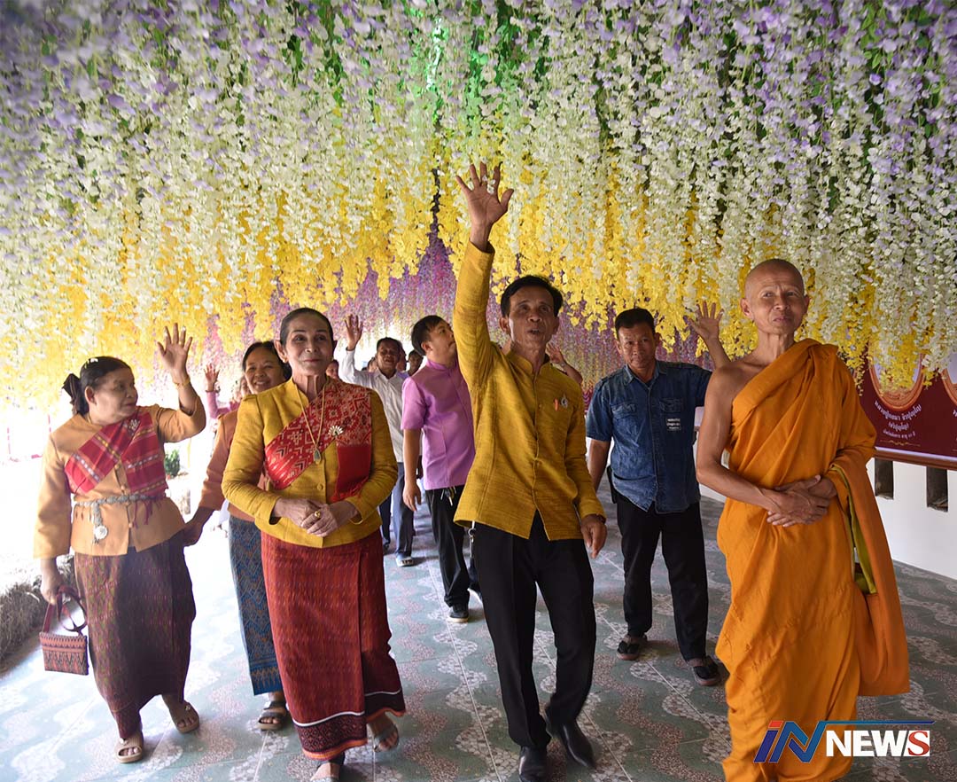 ศรีสะเกษ-ชาวบ้านแห่ทำบุญดอกไม้ล้านดอก ผุดสร้างอุโมงค์สวรรค์ ต้อนรับเดือนแห่งสงกรานต์ 2567