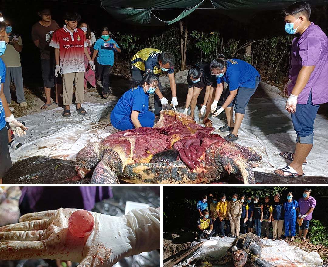 ผ่าซากแม่เต่ามะเฟืองเกยตื้นท้ายเหมือง พบเชือกรัดลำคอตายในท้องมีไข่ด้วย