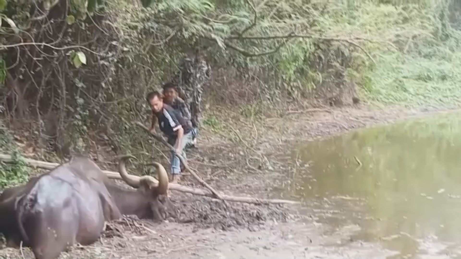 อช.เขาใหญ่นำชบาแก้วกระทิงตาบอด ใส่คอกแล้วเริ่มรู้สึกตัวมีอาการดีขึ้น