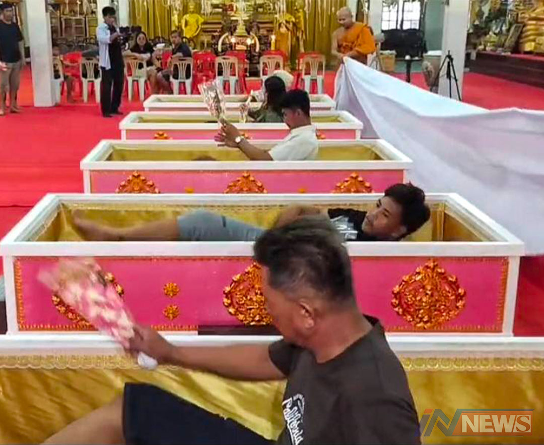 วัดหลวงพ่อปากแดงจัดพิธีนอนโลงศพ สะเดาะเคราะห์ต่อชะตาฝึกก่อนตายจริง