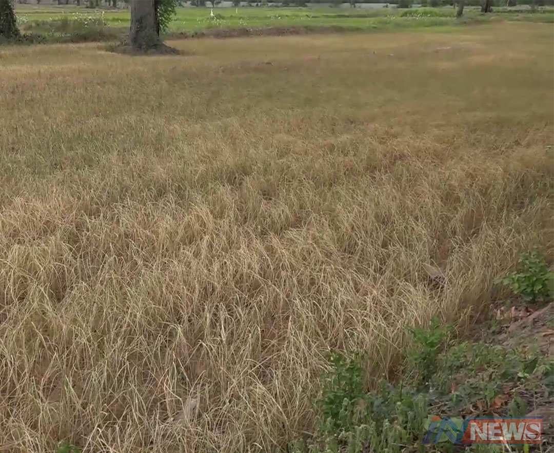 นาข้าวที่สูงเนินเหลืองอร่ามก่อนออกรวง เสียหายจากปัญหาภัยแล้งฝนทิ้งช่วง