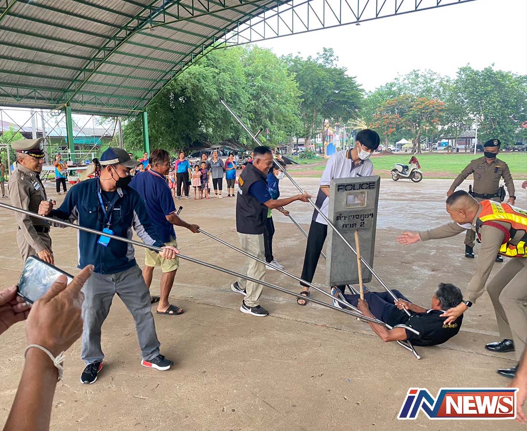 ตร.ศรีมหาโพธิให้ความรู้ชาวบ้านการใช้ชุดไม้ง่ามระงับเหตุบุคคลคลุ้มคลั่ง