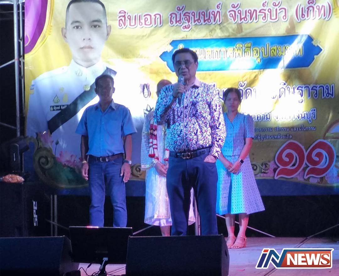 ปราจีนบุรี-นายสุนทร หรือ โกทร ขึ้นอวยพรให้ลูกชายผู้ใหญ่สมชาย จันทร์บัวในโอกาสกราบลาอุปสมบท