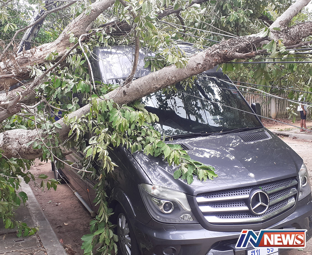 พายุถล่มหนักเสาไฟฟ้าต้นไม้หักทับรถเบนซ์เสียหาย
