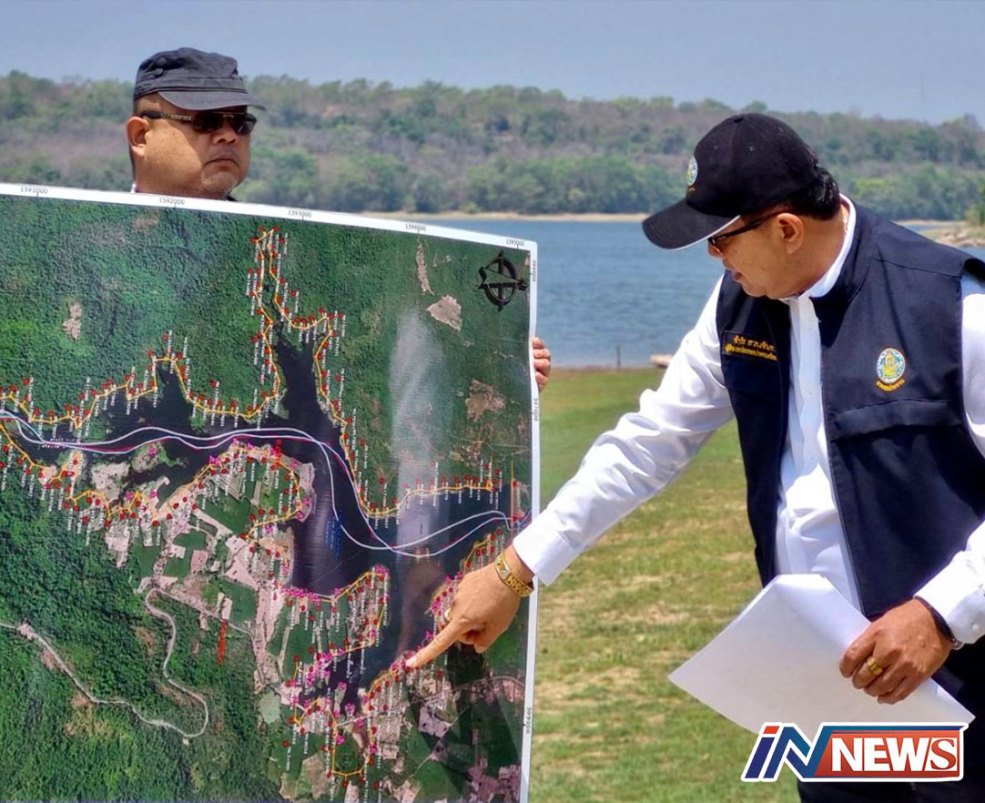 ศรีสะเกษ-ที่บริเวณพื้นที่อ่างเก็บน้ำห้วยสำราญ ชป.ศรีสะเกษ ลุย..ตรวจสอบผู้บุกรุกพื้นที่ชลประทานอ่างเก็บน้ำห้วยสำราญ