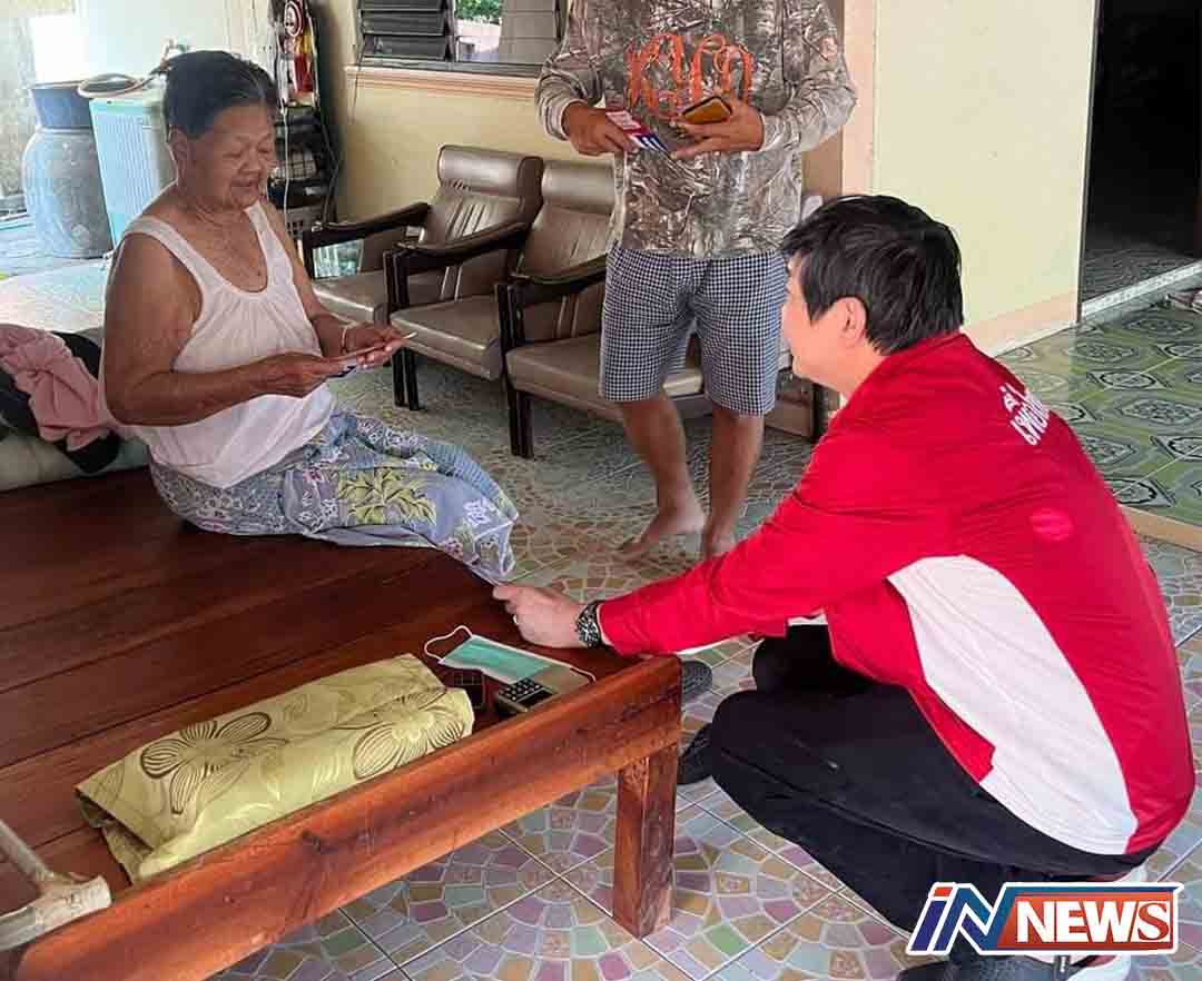 เสี่ยหน่องสวมเสื้อพรรคเพื่อไทยนั่งคุกเข่าขอคะแนนเสียงชาวบ้าน