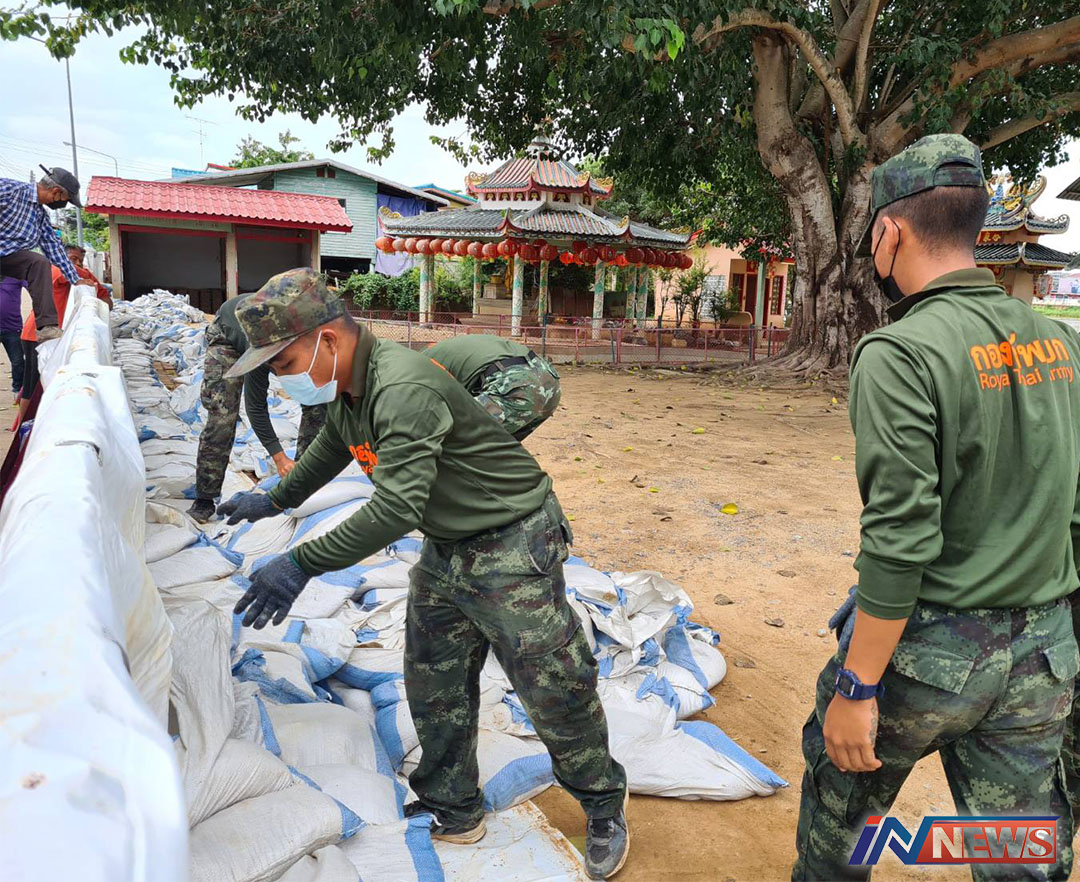 ทหารปืนใหญ่ผนึกกำลังจนท.ทม.สิงห์บุรี บรรจุุถุงทรายทำแนวกั้นน้ำรับมือน้ำเหนือ