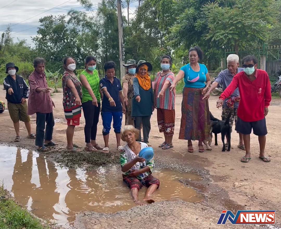 ชาวนากลางสุดทนถนนพังไร้การซ่อมแซม ประชดเอาต้นกล้วยปลูก-ลงไปอาบน้ำ