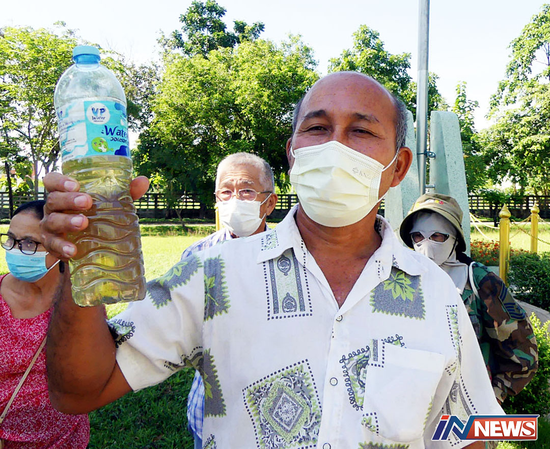 ชาวบ้านถือขวดน้ำเสียทวงถามคำชี้แจง หลังหน่วยงานแจ้งรัฐสภาน้ำไม่เสียแล้ว