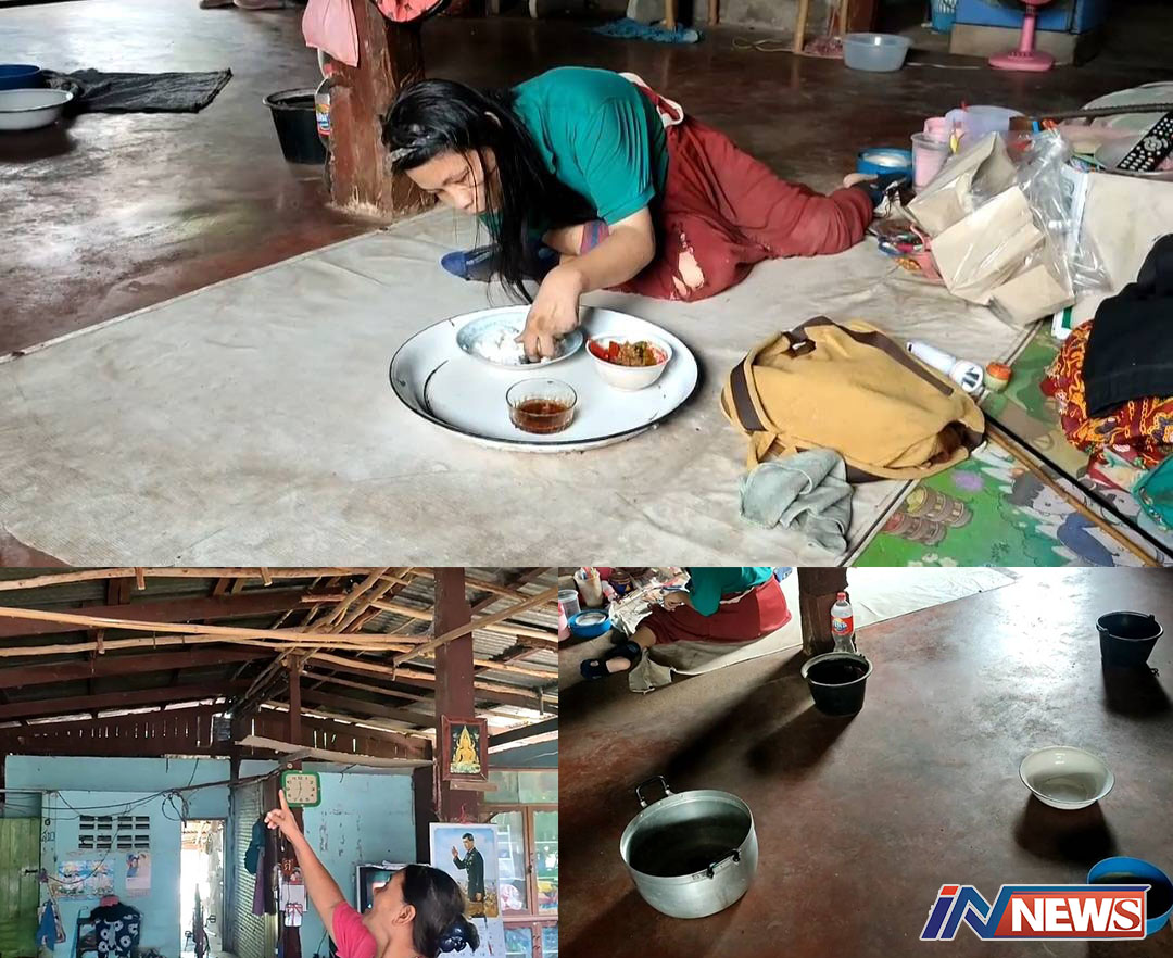 วอนช่วยสองแม่ลูกพิการนอนในบ้านชำรุด สังกะสีมีรูรั่วฝนตกต้องหาถังมารองน้ำ