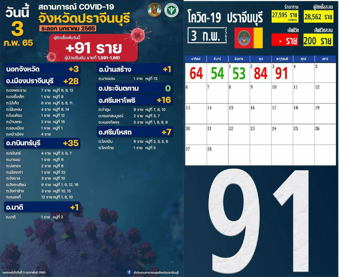 ปราจีนบุรี-โควิด-19วันนี้พุ่งอีก91รายคลัสเตอร์ใหม่จากงานบวชนาค,คลัสเตอร์เทศบาลตำบลโคกปีบขณะคลัสเตอร์โรงเรียนหทัยชาติลามต...