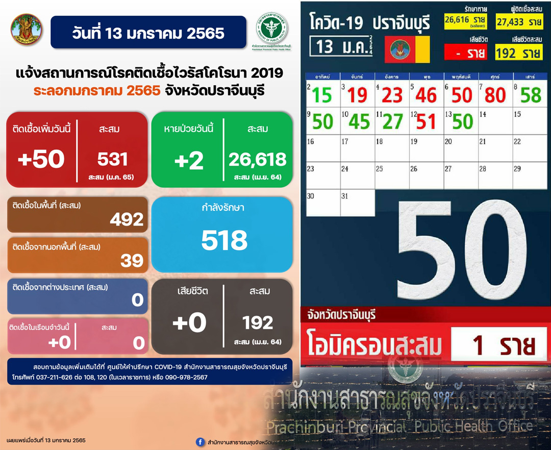 ปราจีนบุรี -พบผู้ติดเชื้อโควิด-19 วันนี้ 50 ราย ขณะพบโอมิครอนรายแรก 1 รายเดินทางไปพื้นที่เสี่ยง ...