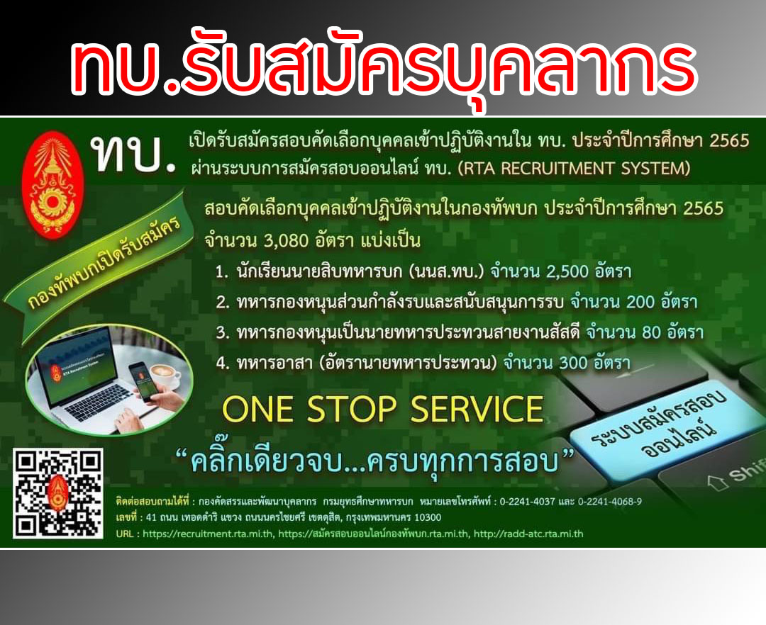กองทัพบก - ประกาศรับสมัครสอบคัดเลือกบุคคลเข้าปฏิบัติงานในกองทัพบก ประจำปี 2565 ซึ่งเปิดรับสมัครตั้งแต่ 1 พ.ย 64 - 5 ม.ค ...