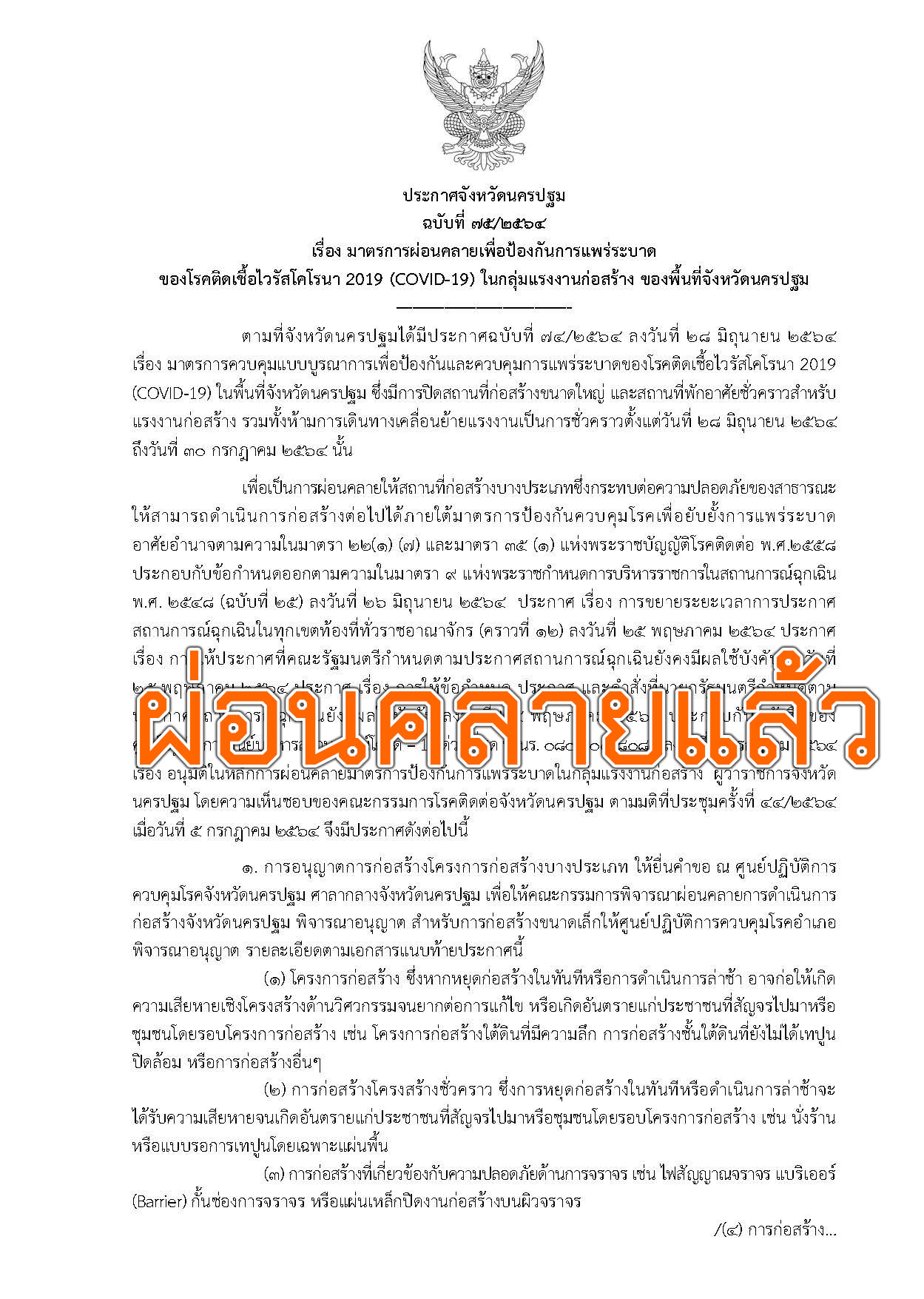 นครปฐม-ผู้ว่าราชการจังหวัดนครปฐมออกประกาศการผ่อนคลายเพื่อป้องกันการแพร่ระบาดของโรคติดเชื้อไวรัสโคโรน่า2019 (COVID-19) ใน...